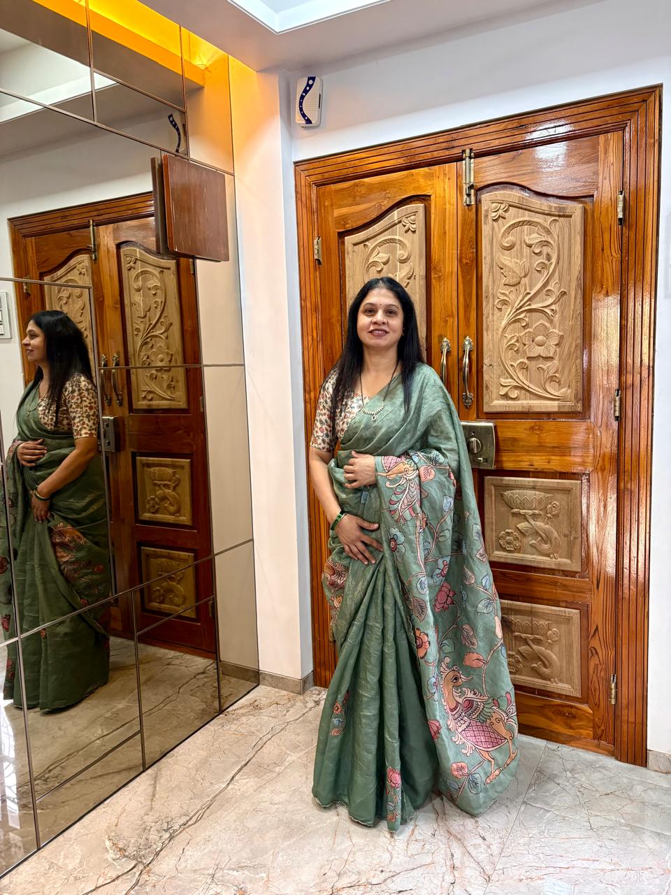 Green Hand-embroidered mulmul saree