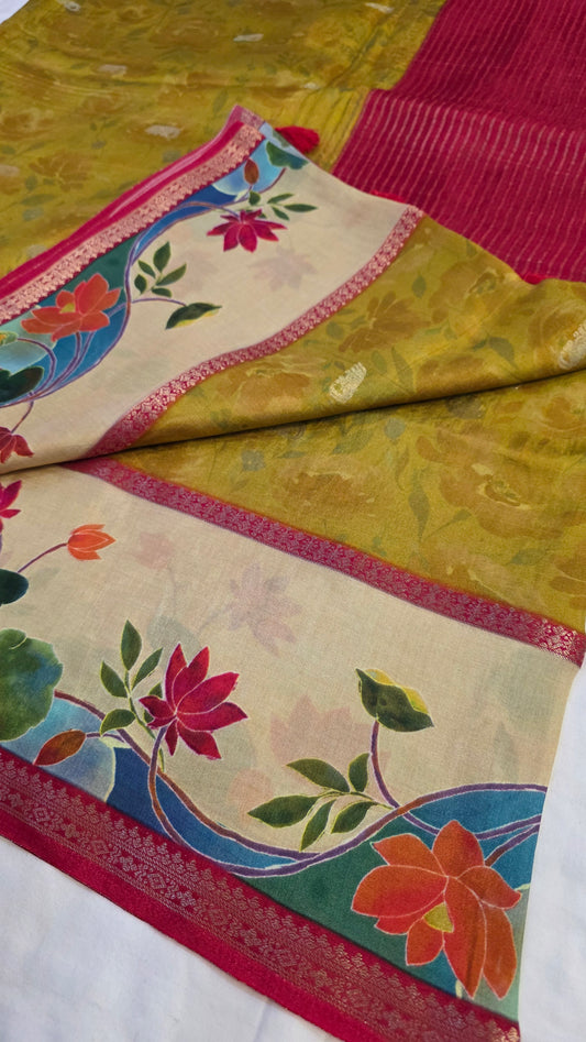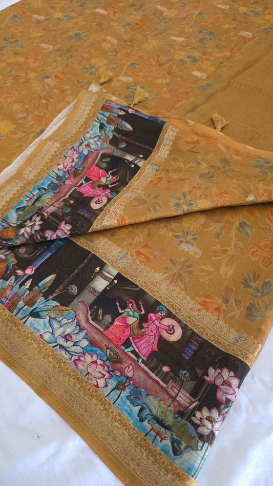 Mustard yellow Dola silk figure Saree