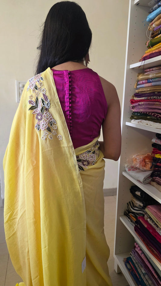 Yellow Hand-embroidered mulmul saree