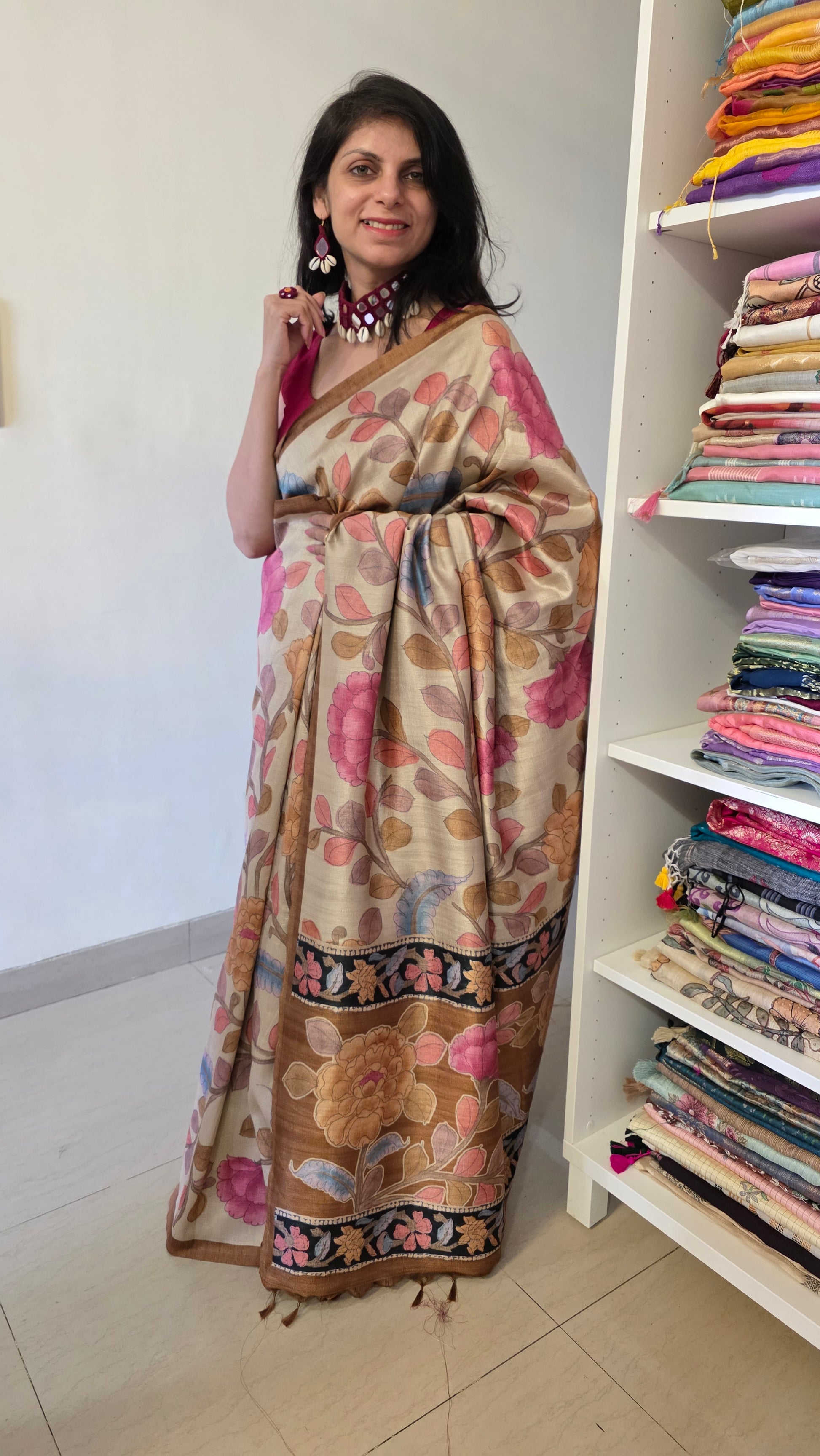 Indulge in the luxurious elegance of our Ivory/brown Tussar silk saree. The exquisite floral pattern of Kalamkari design adds a touch of sophistication to this premium piece, making you stand out in any occasion.