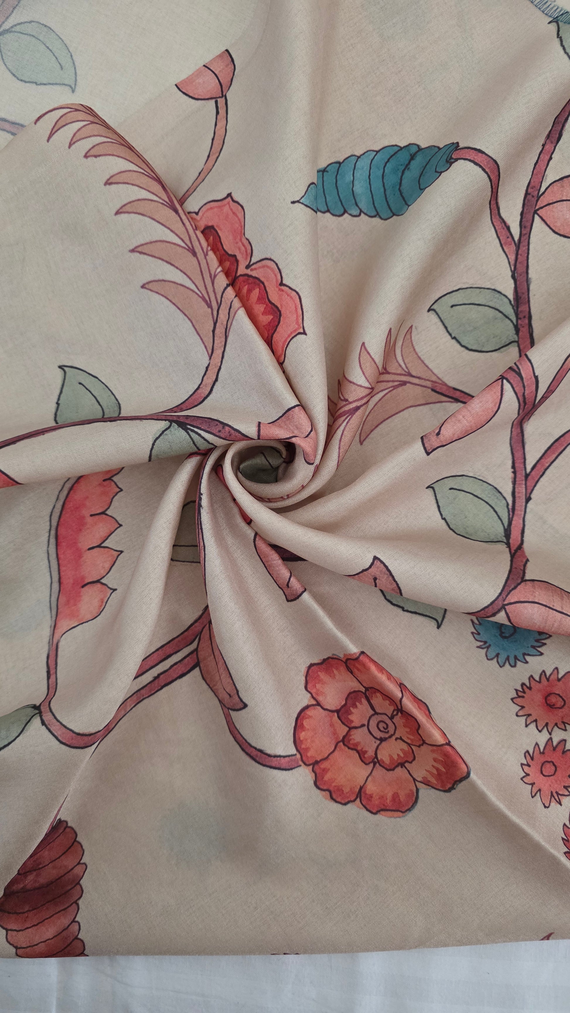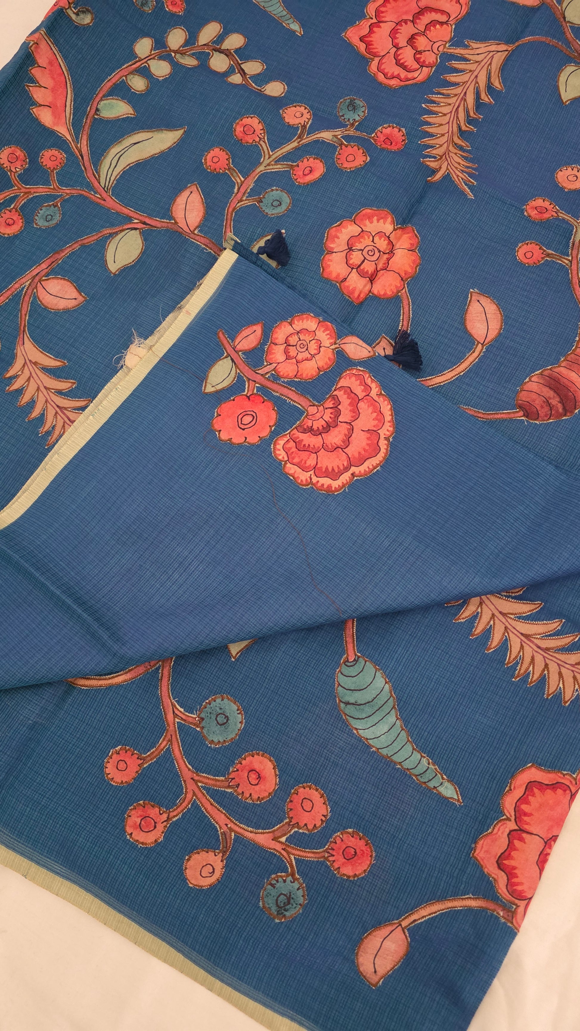 Expertly crafted with lightweight Kota silk, this Red Saree boasts a dhoop chaav color tone and intricate applique work. The kalamkari pattern adds a touch of traditional elegance.