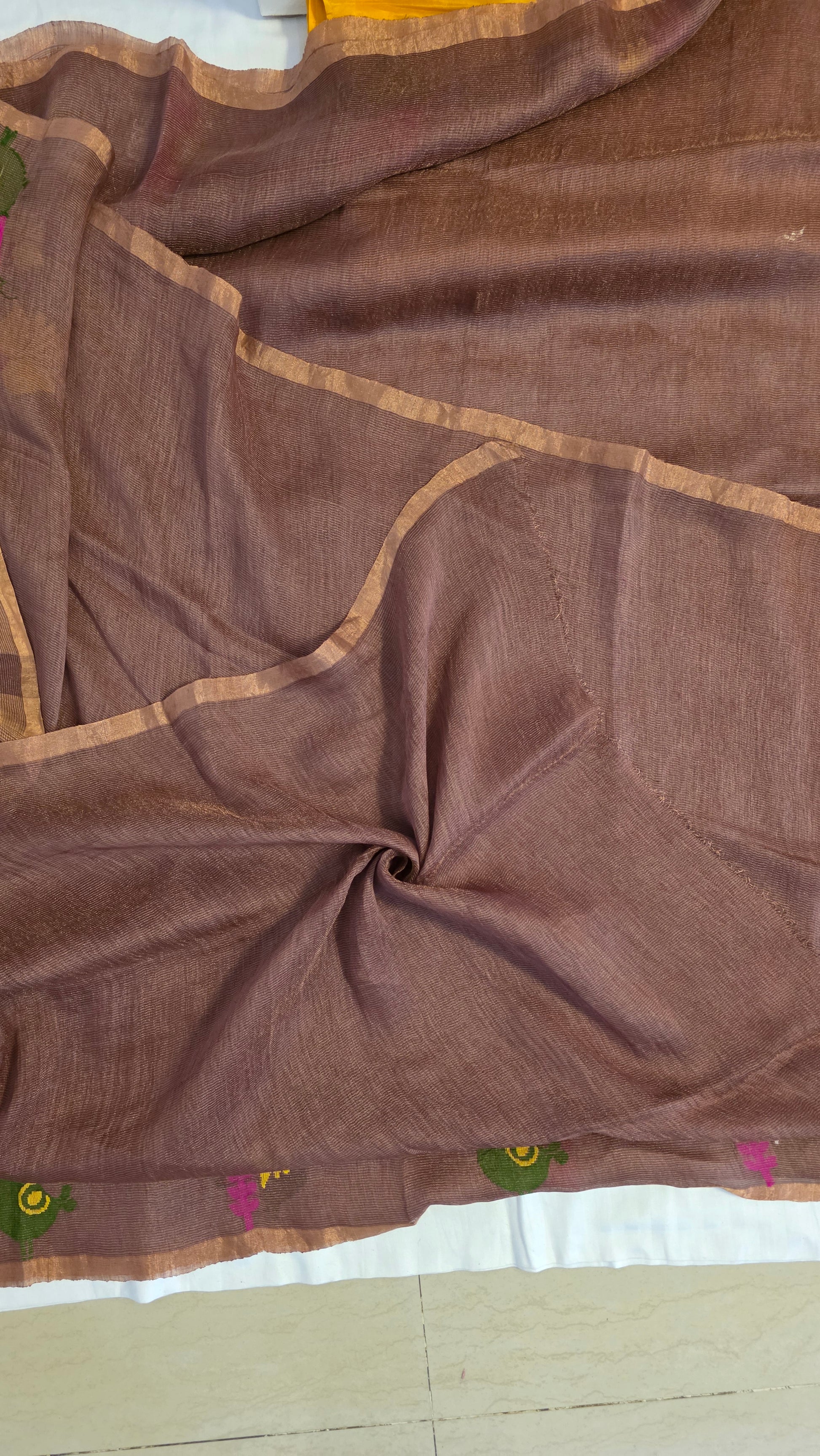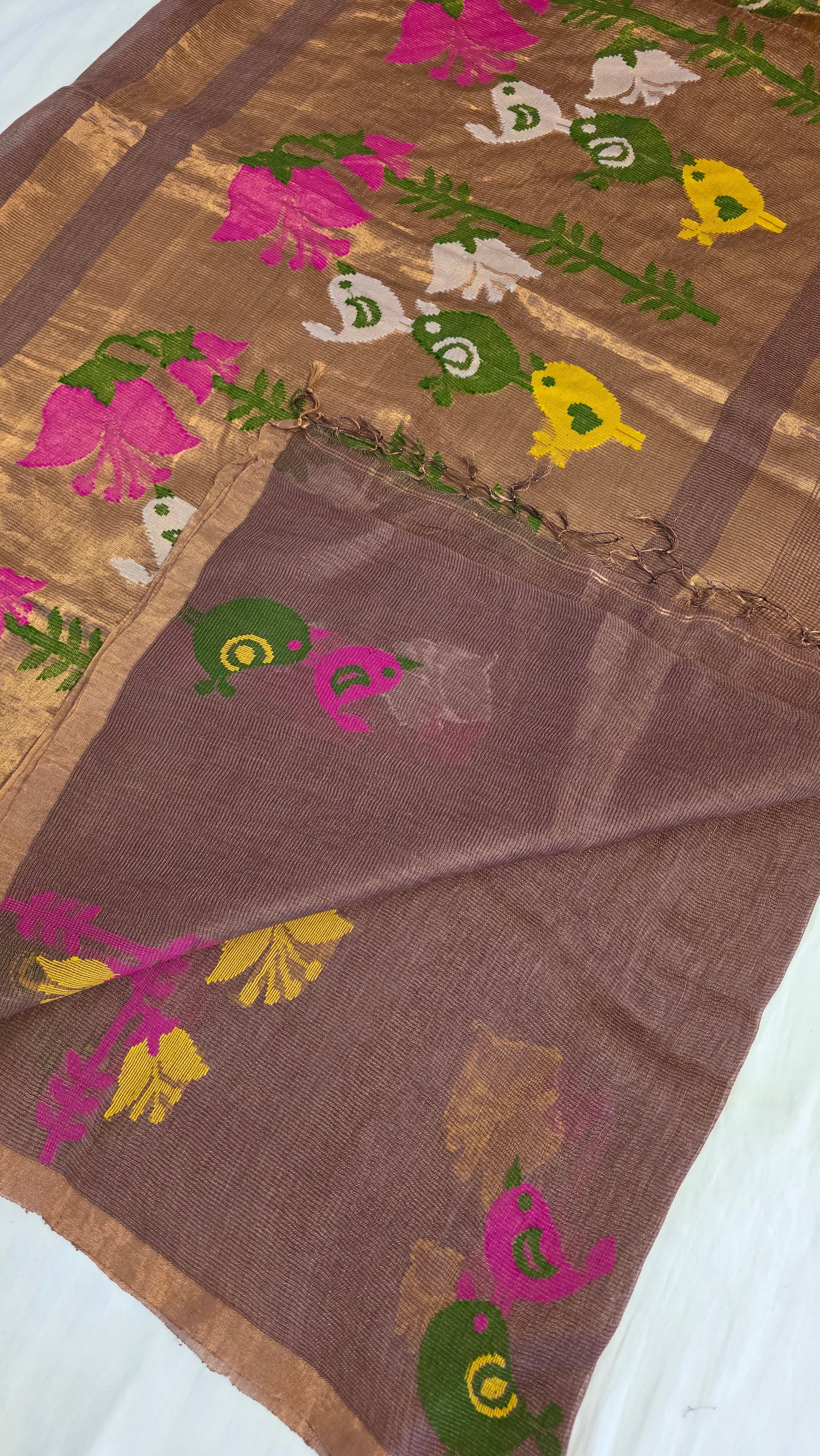 This peach linen Silk Jamdani saree featuring a charming Bird weave. Handcrafted with pure Linen tissue silk using the traditional Jamdani technique, this lightweight and soft saree is the perfect addition to your wardrobe.