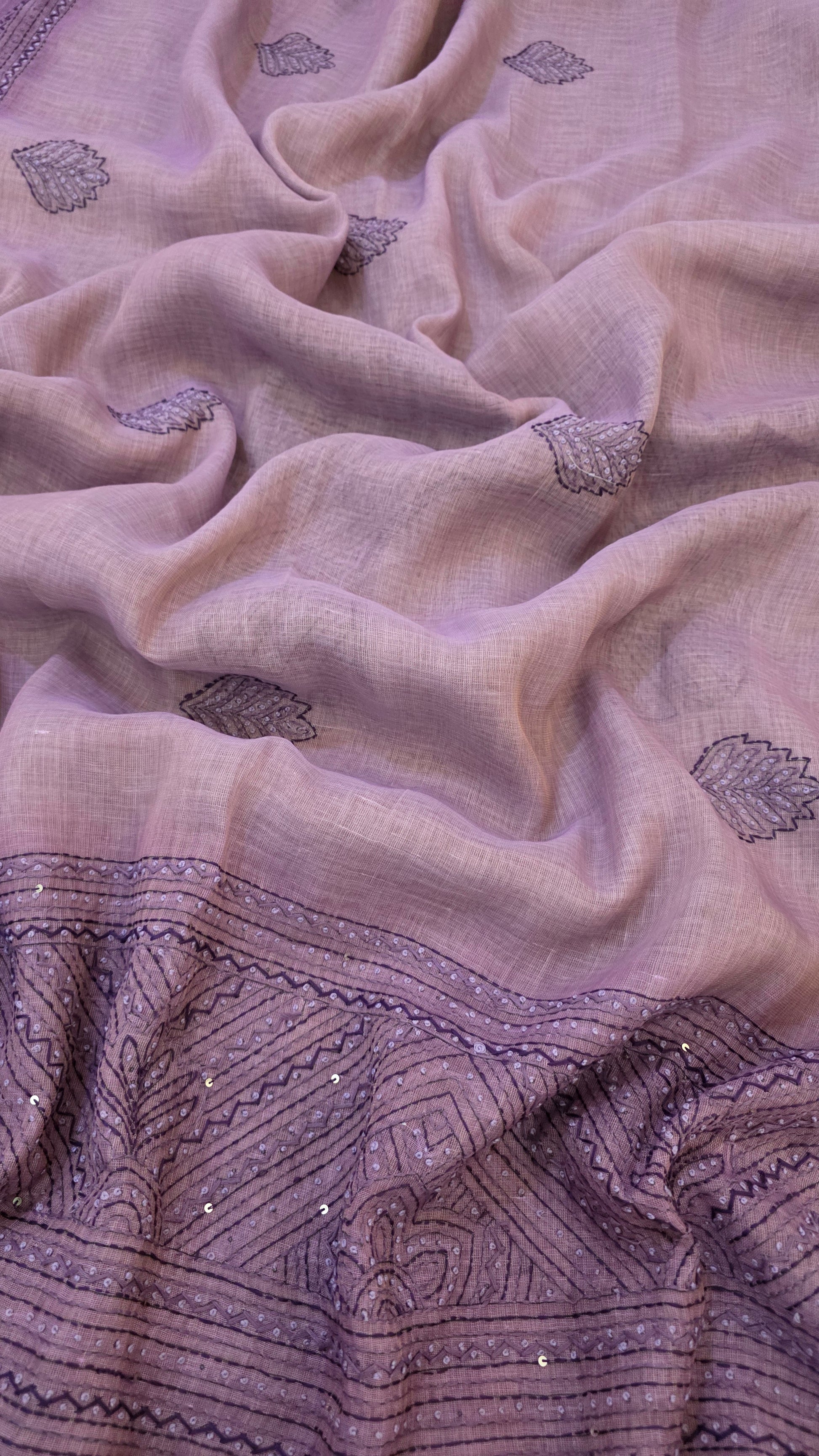 Make a stunning statement with our lavender Embroidered Linen Tissue Silk Saree. Experience luxury and sophistication with the intricate hand embroidery featuring kantha and french knot work. The heavy embroidered blouse adds extra elegance to this premium saree.