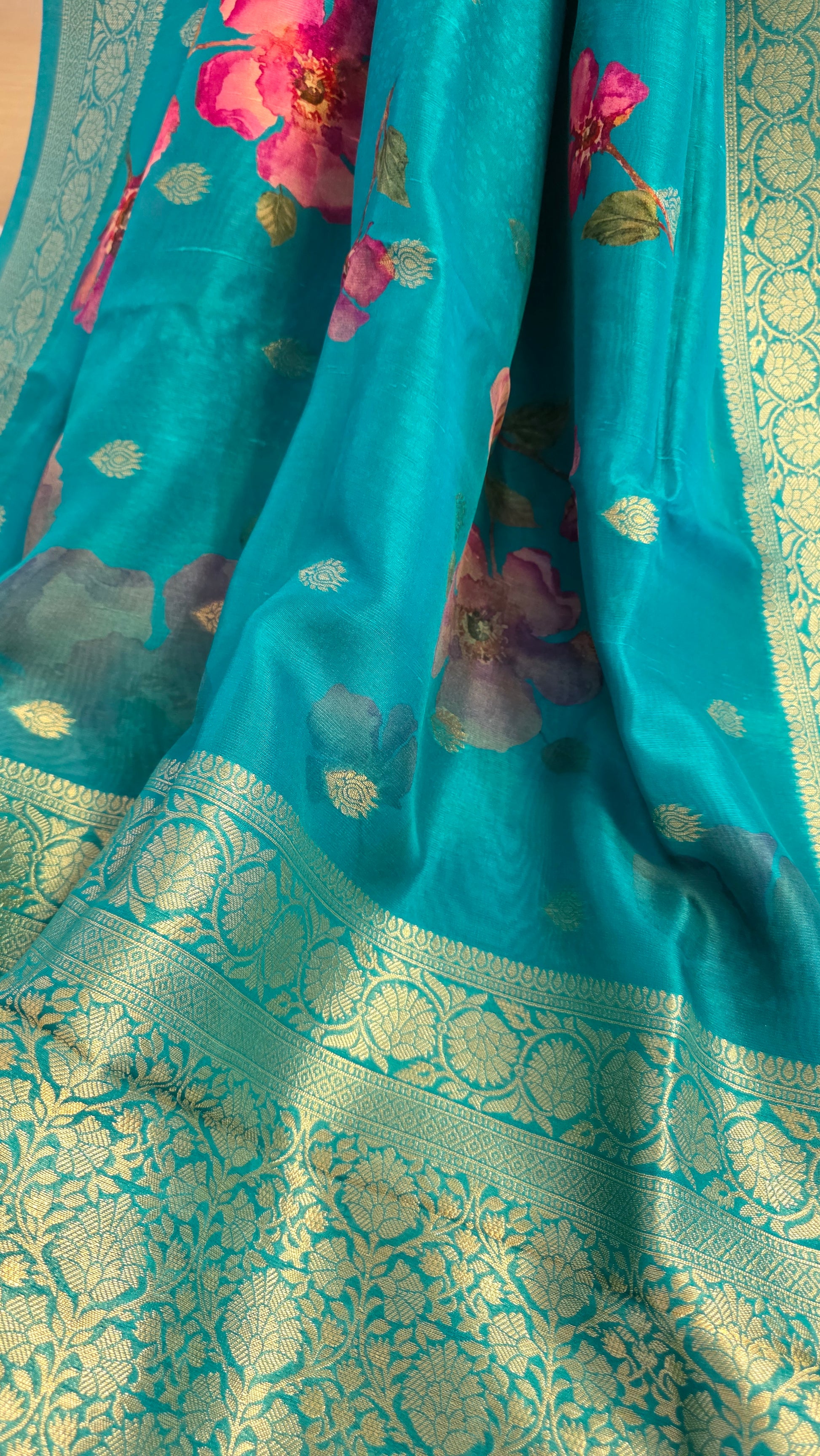 Experience wedding vibes with our Blue Tussar silk saree, featuring a Banarasi pallu and a chic floral print. Made from luxurious Tussar silk, this saree is perfect for adding a pop of color to your wardrobe.