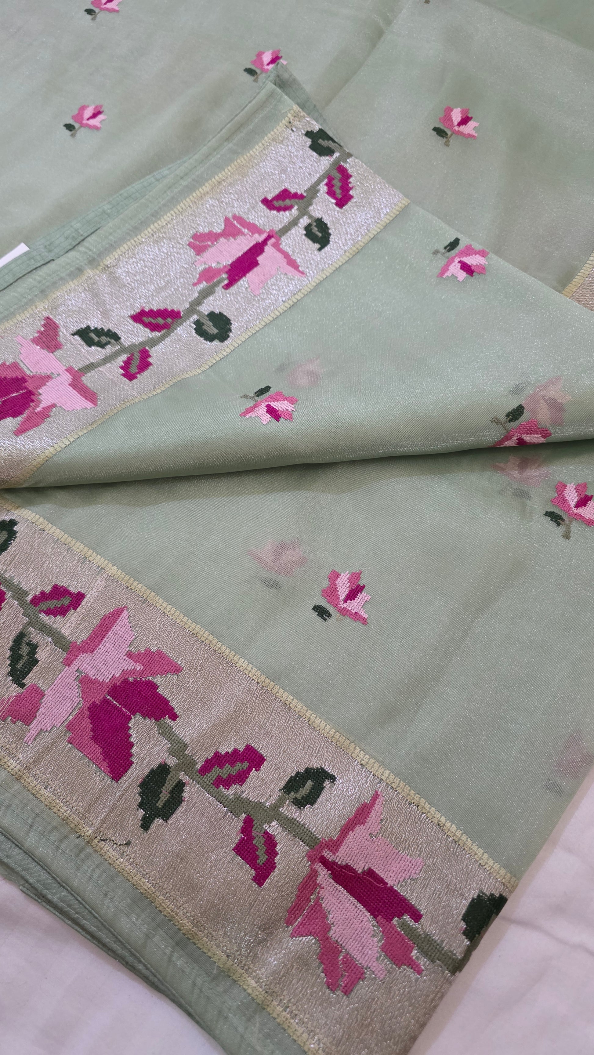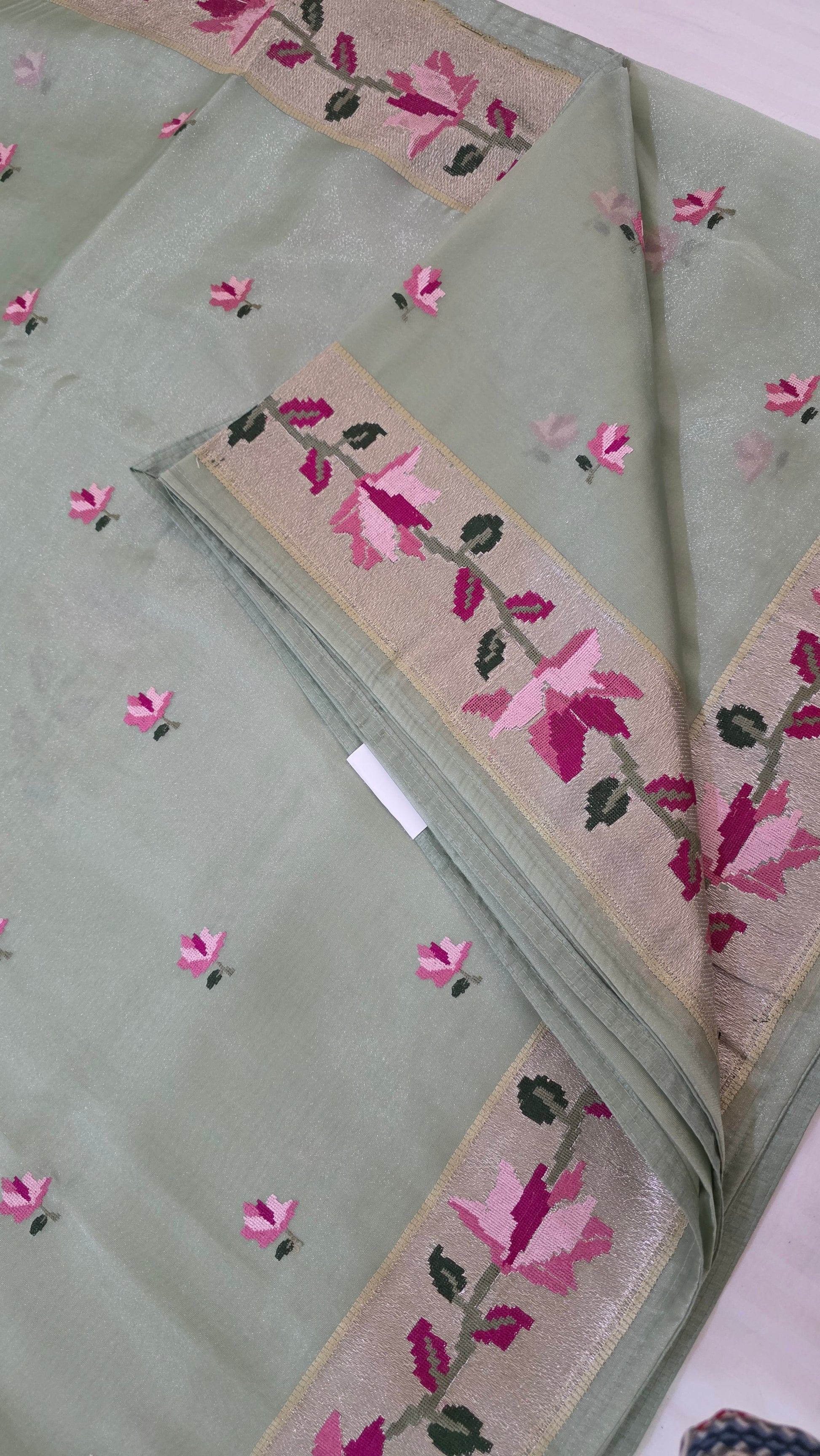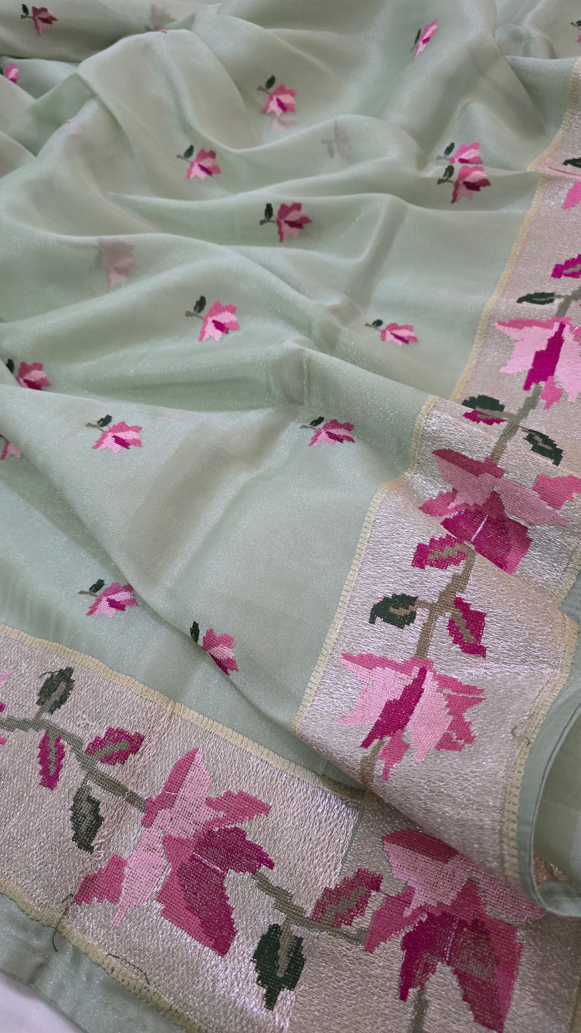 Indulge in luxury with our Green Paithani border Tissue Silk Saree. Made with delicate tissue silk, this saree features a stunning Paithani border adorned with intricate cross stitch embroidery.