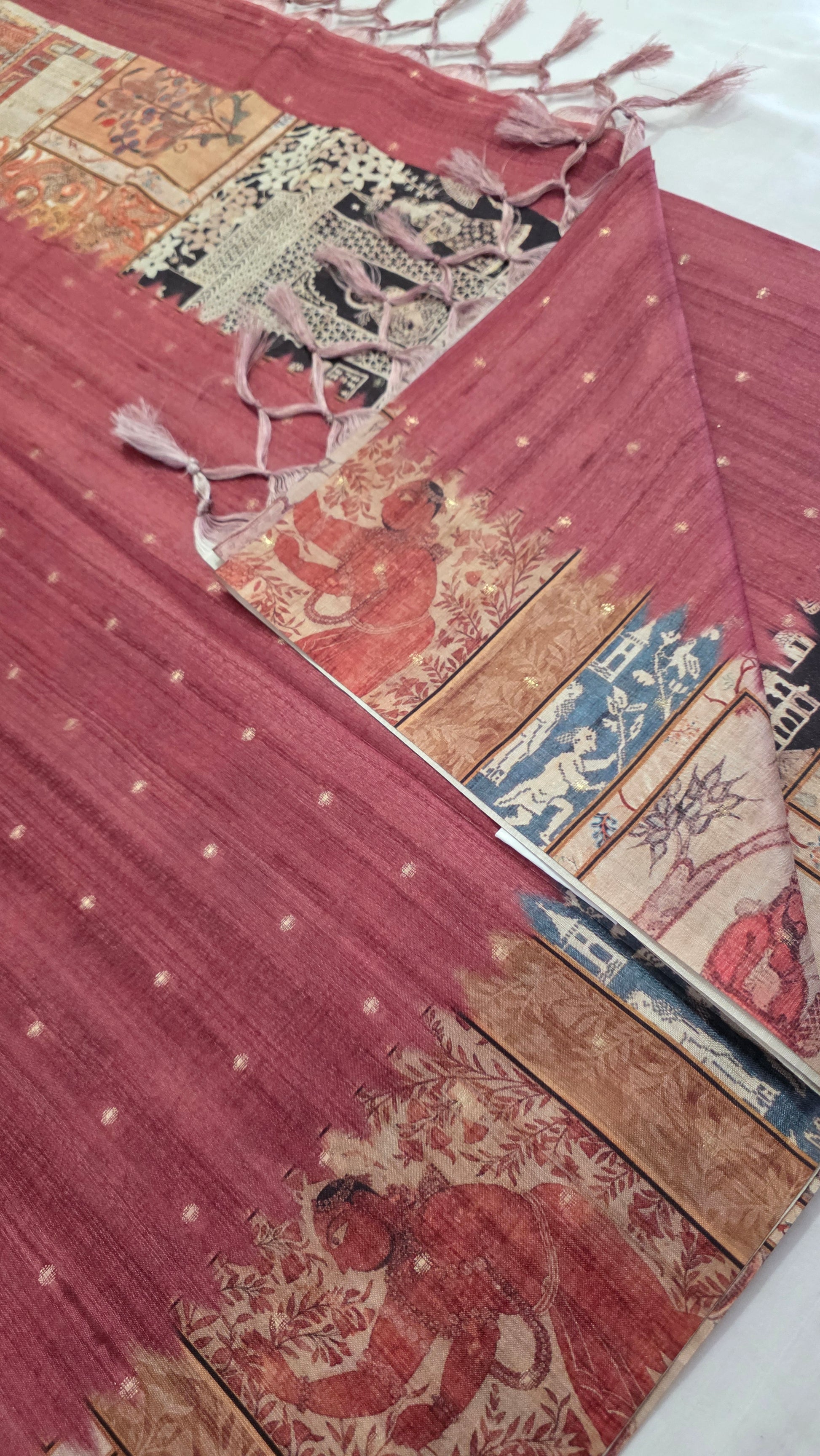 Made from soft and lightweight semi Tussar silk, this Onion pink saree is perfect for semi-formal occasions. Plus, it's pocket friendly, making it a win-win combination of style and affordability. Transform any outfit into a statement with this stunning saree.