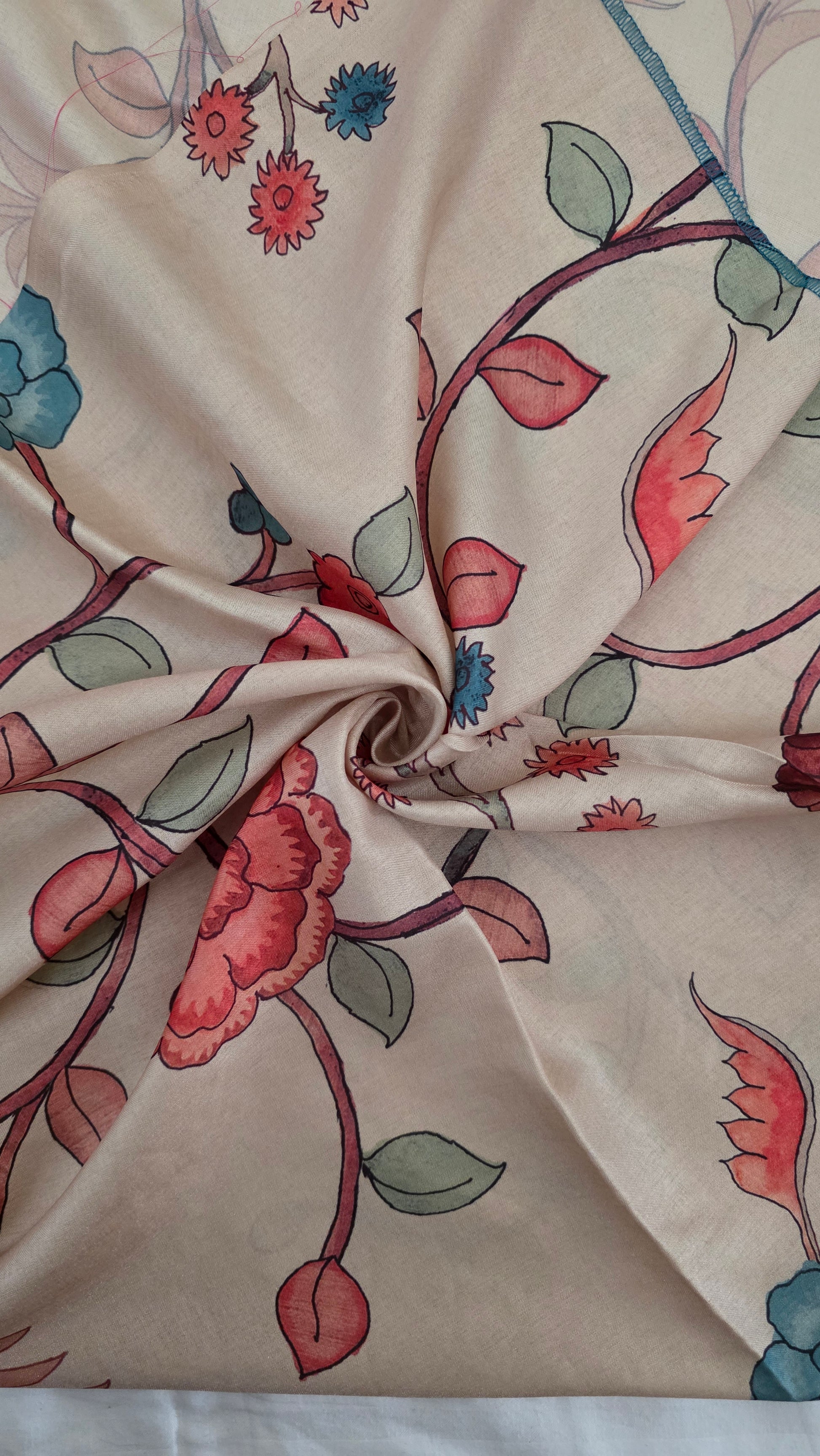 Expertly crafted with lightweight Kota silk, this Red Saree boasts a dhoop chaav color tone and intricate applique work. The kalamkari pattern adds a touch of traditional elegance.