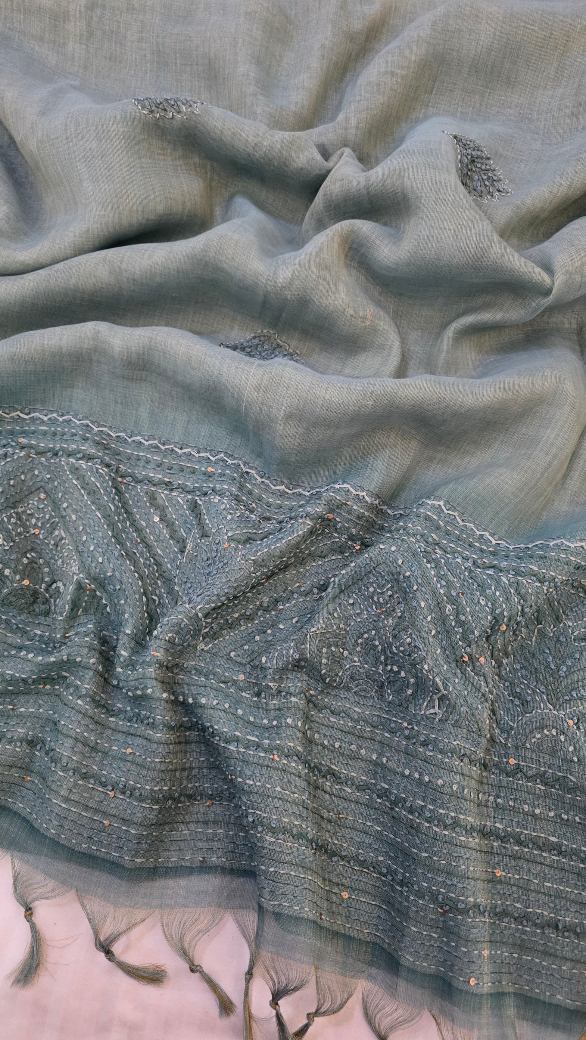 Teal Embroidered Linen Tissue Silk Saree